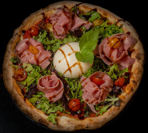 Sauce tomate maison, roquette, jambon, burrata, sauce balsamique